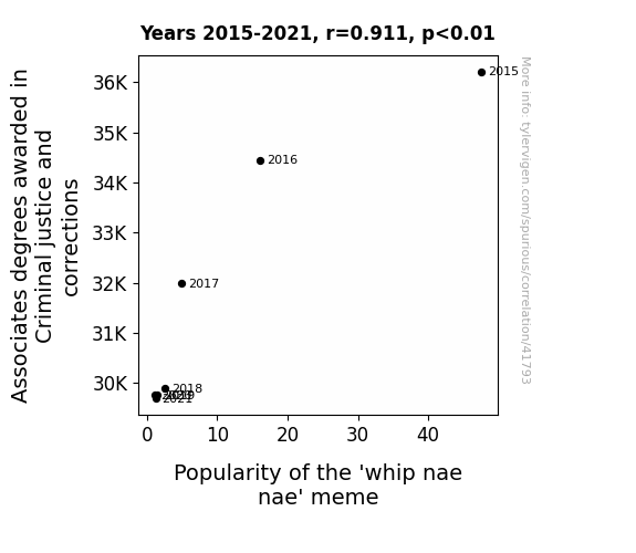This means 82.9% of the change in the one variable (i.e., Popularity of the 'whip nae nae' meme) is predictable based on the change in the other (i.e., Associates degrees awarded in Criminal justice and corrections) over the 7 years from 2015 through 2021.
