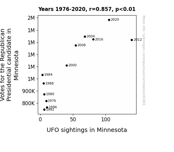 This means 73.4% of the change in the one variable (i.e., UFO sightings in Minnesota) is predictable based on the change in the other (i.e., Votes for the Republican Presidential candidate in Minnesota) over the 12 years from 1976 through 2020.