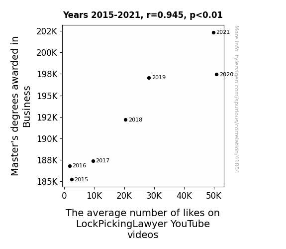 This means 89.4% of the change in the one variable (i.e., The average number of likes on LockPickingLawyer YouTube videos) is predictable based on the change in the other (i.e., Master's degrees awarded in Business) over the 7 years from 2015 through 2021.
