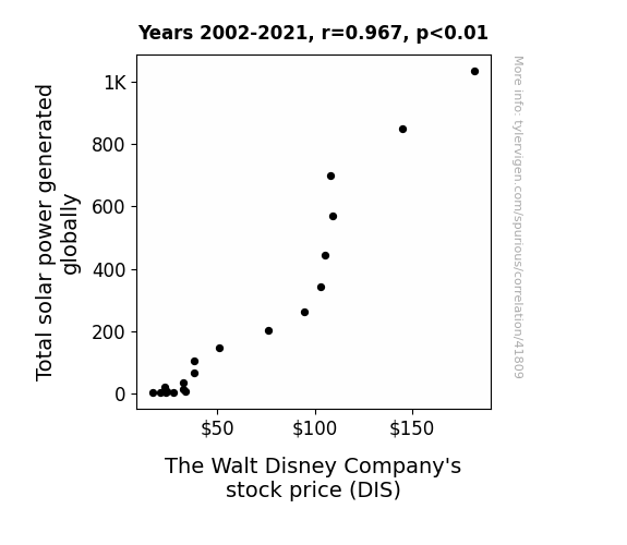 This means 93.4% of the change in the one variable (i.e., The Walt Disney Company's stock price (DIS)) is predictable based on the change in the other (i.e., Total solar power generated globally) over the 20 years from 2002 through 2021.