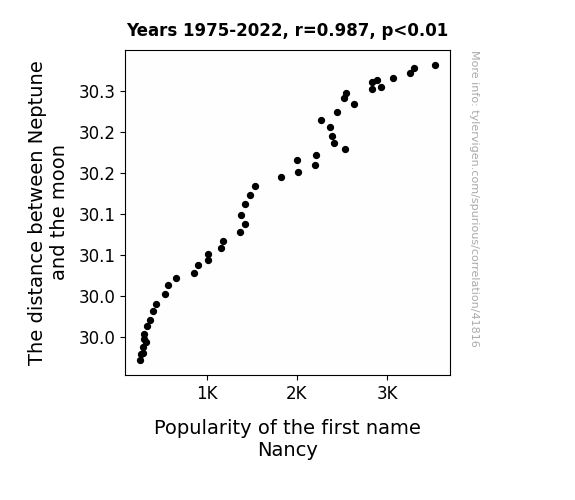 This means 97.4% of the change in the one variable (i.e., Popularity of the first name Nancy) is predictable based on the change in the other (i.e., The distance between Neptune and the moon) over the 48 years from 1975 through 2022.