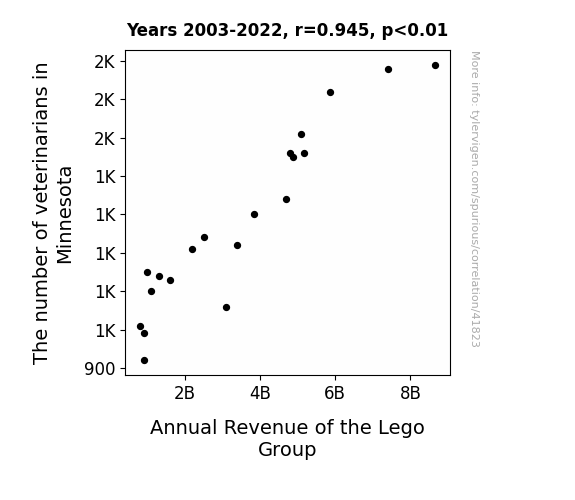 This means 89.3% of the change in the one variable (i.e., Annual Revenue of the Lego Group) is predictable based on the change in the other (i.e., The number of veterinarians in Minnesota) over the 20 years from 2003 through 2022.