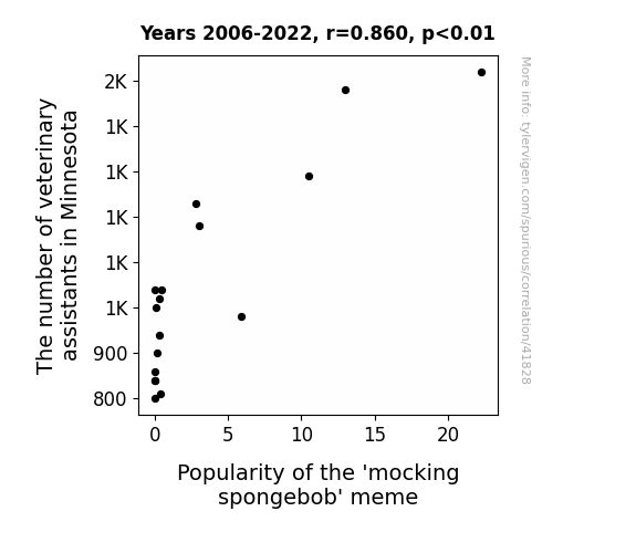 This means 74% of the change in the one variable (i.e., Popularity of the 'mocking spongebob' meme) is predictable based on the change in the other (i.e., The number of veterinary assistants in Minnesota) over the 17 years from 2006 through 2022.