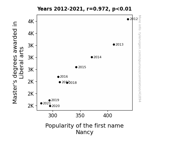 This means 94.6% of the change in the one variable (i.e., Popularity of the first name Nancy) is predictable based on the change in the other (i.e., Master's degrees awarded in Liberal arts) over the 10 years from 2012 through 2021.