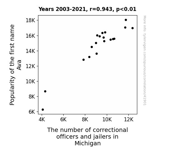 This means 88.9% of the change in the one variable (i.e., The number of correctional officers and jailers in Michigan) is predictable based on the change in the other (i.e., Popularity of the first name Ava) over the 19 years from 2003 through 2021.