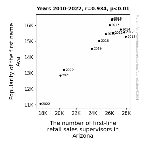 This means 87.3% of the change in the one variable (i.e., The number of first-line retail sales supervisors in Arizona) is predictable based on the change in the other (i.e., Popularity of the first name Ava) over the 13 years from 2010 through 2022.