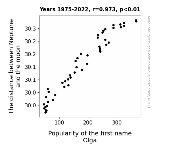 This means 94.7% of the change in the one variable (i.e., Popularity of the first name Olga) is predictable based on the change in the other (i.e., The distance between Neptune and the moon) over the 48 years from 1975 through 2022.