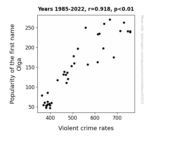 This means 84.2% of the change in the one variable (i.e., Violent crime rates) is predictable based on the change in the other (i.e., Popularity of the first name Olga) over the 38 years from 1985 through 2022.