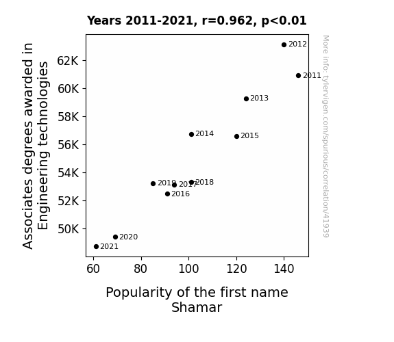 This means 92.6% of the change in the one variable (i.e., Popularity of the first name Shamar) is predictable based on the change in the other (i.e., Associates degrees awarded in Engineering technologies) over the 11 years from 2011 through 2021.