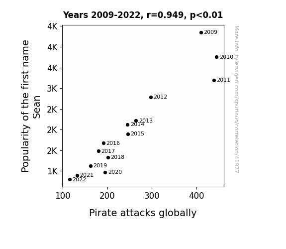 This means 90.1% of the change in the one variable (i.e., Pirate attacks globally) is predictable based on the change in the other (i.e., Popularity of the first name Sean) over the 14 years from 2009 through 2022.