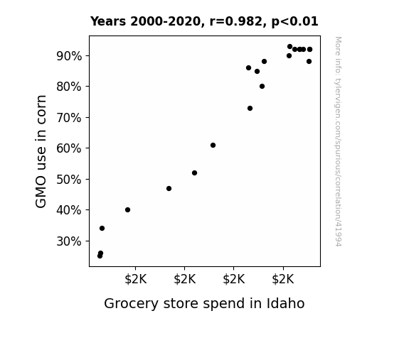 This means 96.5% of the change in the one variable (i.e., Grocery store spend in Idaho) is predictable based on the change in the other (i.e., GMO use in corn) over the 21 years from 2000 through 2020.
