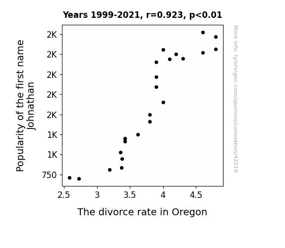 This means 85.3% of the change in the one variable (i.e., The divorce rate in Oregon) is predictable based on the change in the other (i.e., Popularity of the first name Johnathan) over the 23 years from 1999 through 2021.