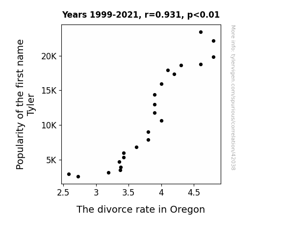 This means 86.6% of the change in the one variable (i.e., The divorce rate in Oregon) is predictable based on the change in the other (i.e., Popularity of the first name Tyler) over the 23 years from 1999 through 2021.