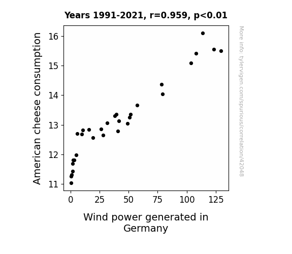 This means 92% of the change in the one variable (i.e., Wind power generated in Germany) is predictable based on the change in the other (i.e., American cheese consumption) over the 31 years from 1991 through 2021.