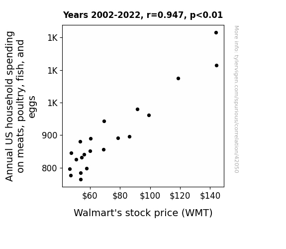 This means 89.7% of the change in the one variable (i.e., Walmart's stock price (WMT)) is predictable based on the change in the other (i.e., Annual US household spending on meats, poultry, fish, and eggs) over the 21 years from 2002 through 2022.