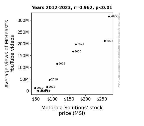 This means 92.5% of the change in the one variable (i.e., Motorola Solutions' stock price (MSI)) is predictable based on the change in the other (i.e., Average views of MrBeast's YouTube videos) over the 12 years from 2012 through 2023.