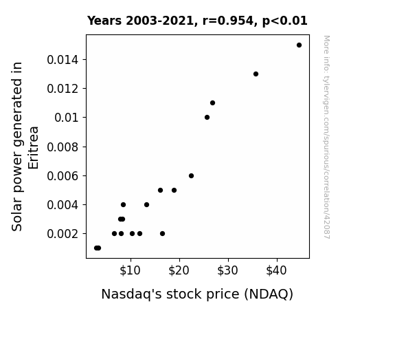 This means 91% of the change in the one variable (i.e., Nasdaq's stock price (NDAQ)) is predictable based on the change in the other (i.e., Solar power generated in Eritrea) over the 19 years from 2003 through 2021.
