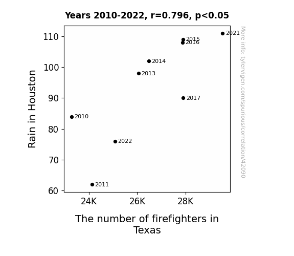 This means 63.3% of the change in the one variable (i.e., The number of firefighters in Texas) is predictable based on the change in the other (i.e., Rain in Houston) over the 9 years from 2010 through 2022.