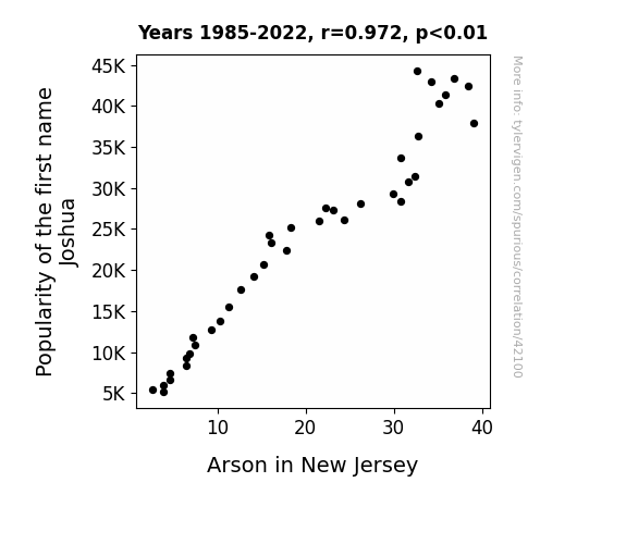 This means 94.5% of the change in the one variable (i.e., Arson in New Jersey) is predictable based on the change in the other (i.e., Popularity of the first name Joshua) over the 38 years from 1985 through 2022.