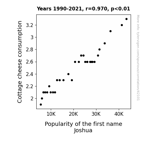 This means 94% of the change in the one variable (i.e., Popularity of the first name Joshua) is predictable based on the change in the other (i.e., Cottage cheese consumption) over the 32 years from 1990 through 2021.