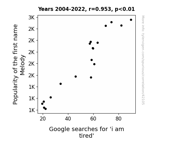 This means 90.9% of the change in the one variable (i.e., Google searches for 'i am tired') is predictable based on the change in the other (i.e., Popularity of the first name Melody) over the 19 years from 2004 through 2022.