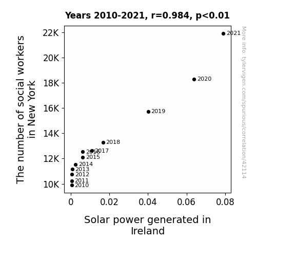 This means 96.9% of the change in the one variable (i.e., Solar power generated in Ireland) is predictable based on the change in the other (i.e., The number of social workers in New York) over the 12 years from 2010 through 2021.