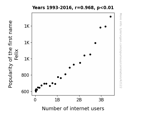 This means 93.7% of the change in the one variable (i.e., Number of internet users) is predictable based on the change in the other (i.e., Popularity of the first name Felix) over the 24 years from 1993 through 2016.