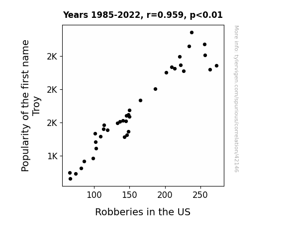 This means 92% of the change in the one variable (i.e., Robberies in the US) is predictable based on the change in the other (i.e., Popularity of the first name Troy) over the 38 years from 1985 through 2022.