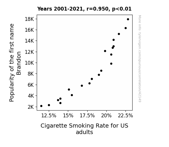This means 90.3% of the change in the one variable (i.e., Cigarette Smoking Rate for US adults) is predictable based on the change in the other (i.e., Popularity of the first name Brandon) over the 21 years from 2001 through 2021.