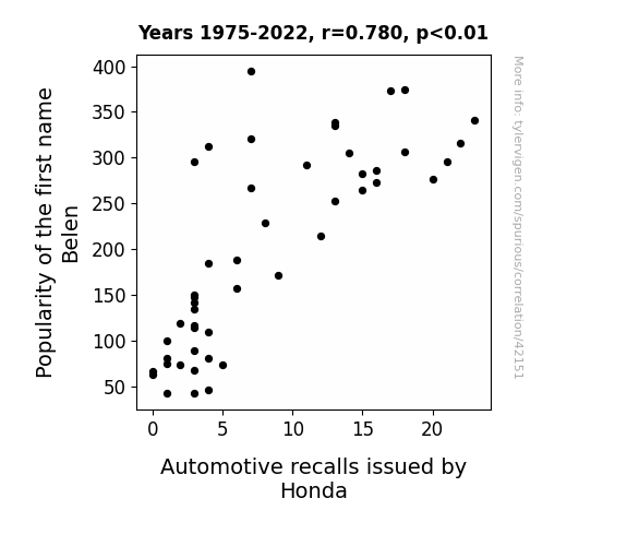 This means 60.8% of the change in the one variable (i.e., Automotive recalls issued by Honda) is predictable based on the change in the other (i.e., Popularity of the first name Belen) over the 48 years from 1975 through 2022.