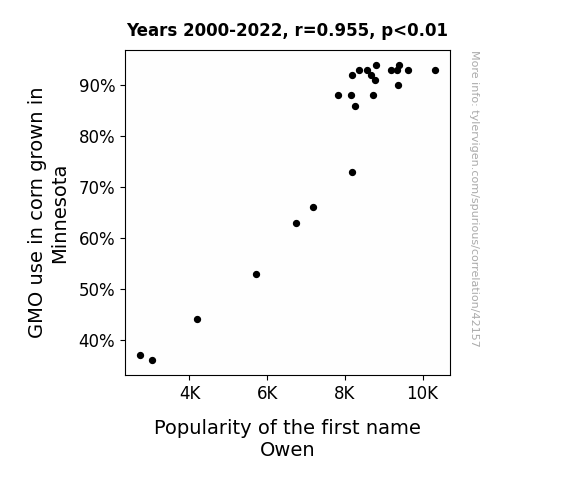 This means 91.1% of the change in the one variable (i.e., Popularity of the first name Owen) is predictable based on the change in the other (i.e., GMO use in corn grown in Minnesota) over the 23 years from 2000 through 2022.