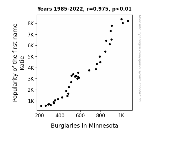 This means 95.1% of the change in the one variable (i.e., Burglaries in Minnesota) is predictable based on the change in the other (i.e., Popularity of the first name Katie) over the 38 years from 1985 through 2022.