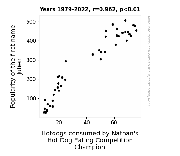 This means 92.6% of the change in the one variable (i.e., Hotdogs consumed by Nathan's Hot Dog Eating Competition Champion) is predictable based on the change in the other (i.e., Popularity of the first name Julien) over the 44 years from 1979 through 2022.