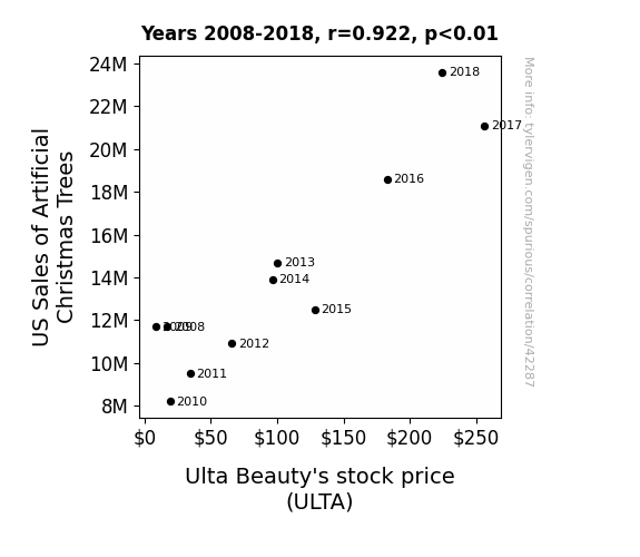 This means 85.1% of the change in the one variable (i.e., Ulta Beauty's stock price (ULTA)) is predictable based on the change in the other (i.e., US Sales of Artificial Christmas Trees) over the 11 years from 2008 through 2018.
