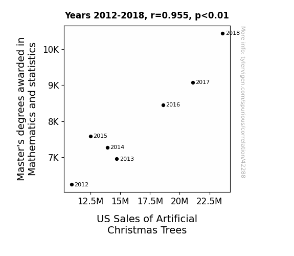 This means 91.1% of the change in the one variable (i.e., US Sales of Artificial Christmas Trees) is predictable based on the change in the other (i.e., Master's degrees awarded in Mathematics and statistics) over the 7 years from 2012 through 2018.