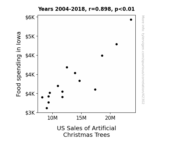 This means 80.7% of the change in the one variable (i.e., US Sales of Artificial Christmas Trees) is predictable based on the change in the other (i.e., Food spending in Iowa) over the 15 years from 2004 through 2018.
