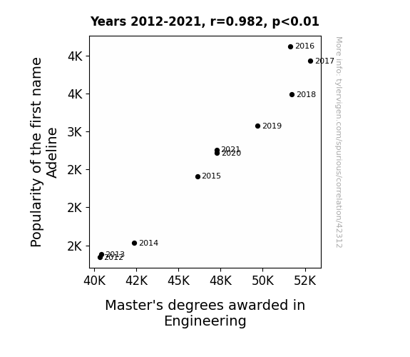 This means 96.4% of the change in the one variable (i.e., Master's degrees awarded in Engineering) is predictable based on the change in the other (i.e., Popularity of the first name Adeline) over the 10 years from 2012 through 2021.