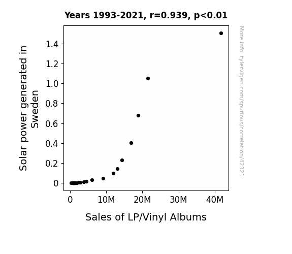 This means 88.1% of the change in the one variable (i.e., Sales of LP/Vinyl Albums) is predictable based on the change in the other (i.e., Solar power generated in Sweden) over the 29 years from 1993 through 2021.