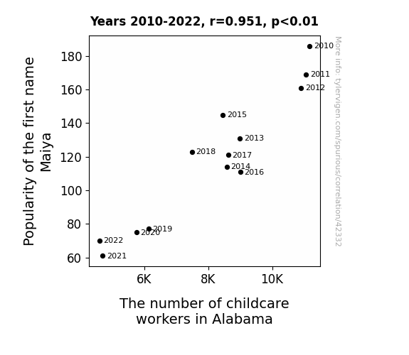This means 90.5% of the change in the one variable (i.e., The number of childcare workers in Alabama) is predictable based on the change in the other (i.e., Popularity of the first name Maiya) over the 13 years from 2010 through 2022.