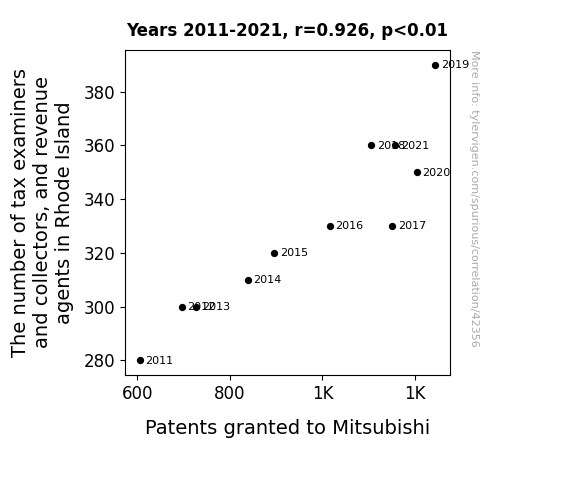 This means 85.7% of the change in the one variable (i.e., Patents granted to Mitsubishi) is predictable based on the change in the other (i.e., The number of tax examiners and collectors, and revenue agents in Rhode Island) over the 11 years from 2011 through 2021.