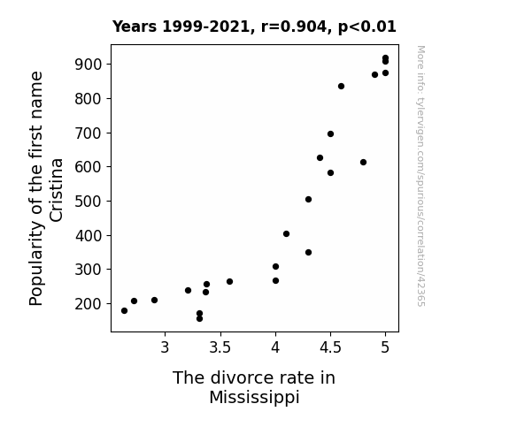 This means 81.7% of the change in the one variable (i.e., The divorce rate in Mississippi) is predictable based on the change in the other (i.e., Popularity of the first name Cristina) over the 23 years from 1999 through 2021.