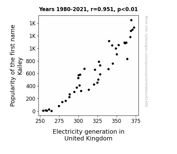 This means 90.5% of the change in the one variable (i.e., Electricity generation in United Kingdom) is predictable based on the change in the other (i.e., Popularity of the first name Kailey) over the 42 years from 1980 through 2021.