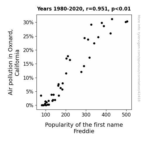 This means 90.5% of the change in the one variable (i.e., Popularity of the first name Freddie) is predictable based on the change in the other (i.e., Air pollution in Oxnard, California) over the 41 years from 1980 through 2020.