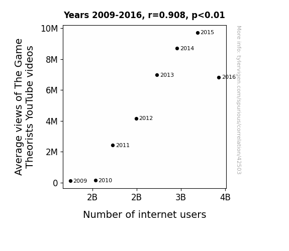 This means 82.4% of the change in the one variable (i.e., Number of internet users) is predictable based on the change in the other (i.e., Average views of The Game Theorists YouTube videos) over the 8 years from 2009 through 2016.