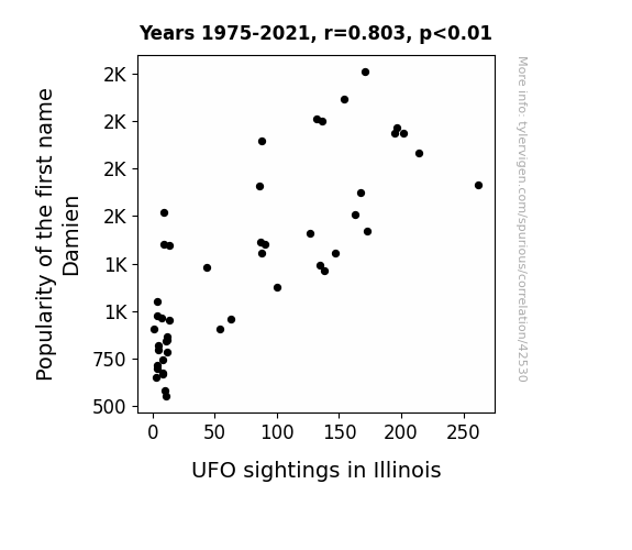 This means 64.4% of the change in the one variable (i.e., UFO sightings in Illinois) is predictable based on the change in the other (i.e., Popularity of the first name Damien) over the 47 years from 1975 through 2021.
