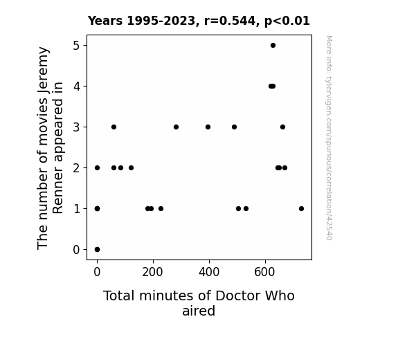 This means 29.6% of the change in the one variable (i.e., Total minutes of Doctor Who aired) is predictable based on the change in the other (i.e., The number of movies Jeremy Renner appeared in) over the 29 years from 1995 through 2023.