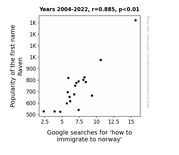 This means 78.3% of the change in the one variable (i.e., Google searches for 'how to immigrate to norway') is predictable based on the change in the other (i.e., Popularity of the first name Raven) over the 19 years from 2004 through 2022.