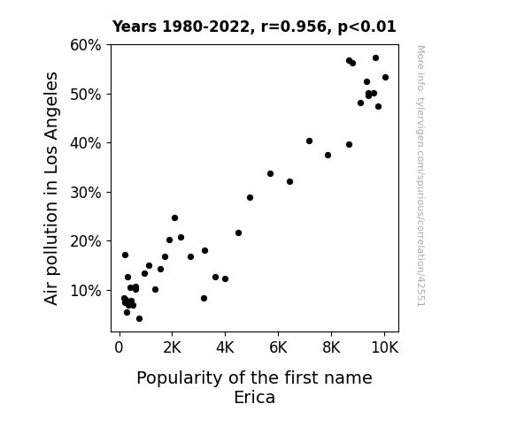 This means 91.3% of the change in the one variable (i.e., Popularity of the first name Erica) is predictable based on the change in the other (i.e., Air pollution in Los Angeles) over the 43 years from 1980 through 2022.