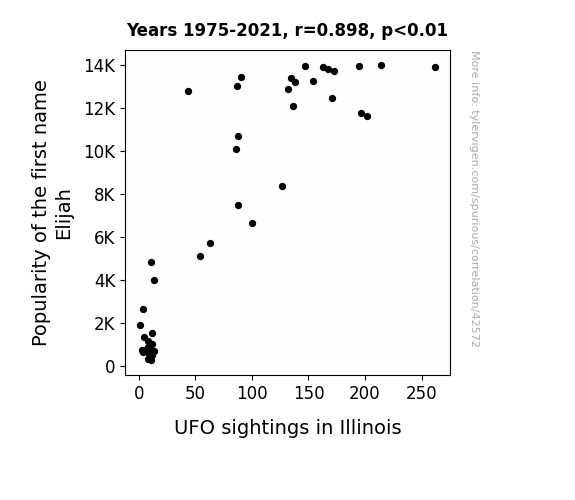 This means 80.7% of the change in the one variable (i.e., UFO sightings in Illinois) is predictable based on the change in the other (i.e., Popularity of the first name Elijah) over the 47 years from 1975 through 2021.