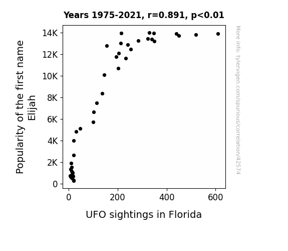 This means 79.3% of the change in the one variable (i.e., UFO sightings in Florida) is predictable based on the change in the other (i.e., Popularity of the first name Elijah) over the 47 years from 1975 through 2021.